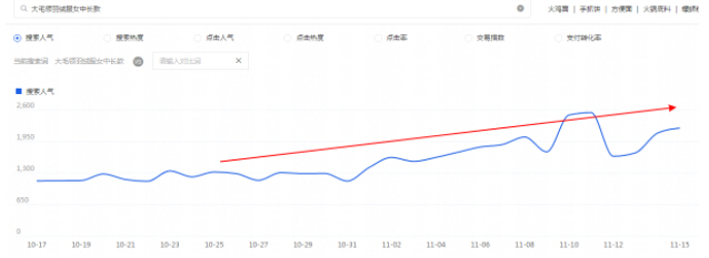 這里要使用的數(shù)據(jù)采集工具是淘寶官方的生意參謀市場洞察標(biāo)準(zhǔn)版,在市場--搜索分析--輸入關(guān)鍵詞,在這里我輸入“大毛領(lǐng)羽絨服女中長款”首先我們要看的是這個關(guān)鍵詞的近期的市場趨勢是上升還是下滑,如果是下滑趨勢,那就要考慮下這款產(chǎn)品是否能作為店鋪主推款了。