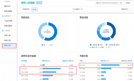 上圖可以看到搜索跑步鞋的買家搜索點擊人氣最高的是75-135元,其次是135-190元,所以當你做跑步鞋的產品的時候只能選擇一個價格帶的產品,不能跨價格帶,年齡分布都是年輕人比較多的,這種情況下我們的店鋪裝修風格以及詳情產品圖及裝修風格我們都是要偏年輕化才行。