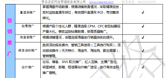 二、店鋪時間設(shè)計好了,下一步是什么,沒錯。當然是各種營銷推廣了,不管是直通車、鉆展這類的站內(nèi)推廣,還有站外推廣,都是一個店鋪所必須的引流方式。易亞為您提供專業(yè)運營推廣服務(wù),為您的流量保駕護航。