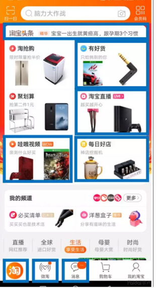 這兩年,電商領(lǐng)域最火的詞一定是“內(nèi)容營銷”了。提到內(nèi)容化,還是先提一下網(wǎng)紅電商。2016年網(wǎng)紅開始火,那時有顏值的或者能東北二人轉(zhuǎn)式搞笑的都能紅;2017年要有一定特色的才藝展示的才能紅;2018年要有真正持續(xù)產(chǎn)出內(nèi)容的才能紅。特別是走過2018年到了2019年,網(wǎng)紅要想變現(xiàn),擁有持續(xù)產(chǎn)出內(nèi)容的能力是基本能力。網(wǎng)紅,多數(shù)只能紅極一時,網(wǎng)在繼續(xù),紅卻并不能繼續(xù)。不同時期有不同時期的網(wǎng)紅。我們現(xiàn)在在心里想一下,三年前的網(wǎng)紅是誰?一般來講我們是記不起的。就算記得起名字,在今天那個網(wǎng)紅也已經(jīng)不紅了。所有的品牌都是需要時間積累的,我們之所以能記住一些影視明星,這些人還能持續(xù)紅,一般都是他們有代表性的影視作品并且每年還在不斷地反復(fù)輪播或者還有新的作品上市。什么是內(nèi)容?就好比是明星的影視作品,只有經(jīng)典的影視作品才能深入人心,影響人們的心智。那么電商的內(nèi)容化,就是要把產(chǎn)品或者品牌的調(diào)性、風(fēng)格做成專業(yè)、好玩、有趣、有靈魂,呈現(xiàn)這些的具體過程就是內(nèi)容化。表現(xiàn)形式可以是文字、圖片、短視頻、直播、VR/AR等。我們來看一下平臺的布局:下圖是手機淘寶的首頁,藍色框所在的模塊全都是內(nèi)容板塊。內(nèi)容板塊所占首頁篇幅之大,一目了然。足可見,內(nèi)容化是平臺的主要方向。大品牌商家應(yīng)該想辦法通過內(nèi)容讓消費者更多維度的喜歡和追隨。中小商家也應(yīng)該重視內(nèi)容,至少讓某一類消費者愛上你,可以很幽默、很搞笑、很好玩、很逗比、很小眾、很有才,這些皆內(nèi)容。