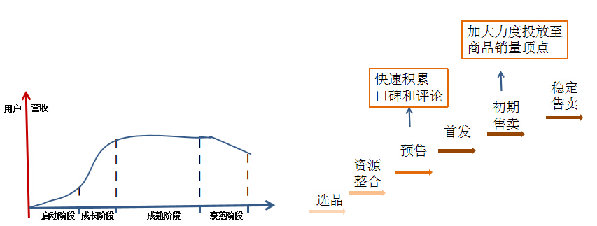 爆款分為4個階段:啟動階段、成長階段、成熟階段、衰落階段,不同的階段針對性的做不同的工作。啟動階段包含:選品、資源整合、測款;成長階段包含:預售、首發(fā);成熟階段包含初期售賣;衰落階段包含:穩(wěn)定售賣。