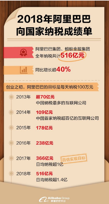 易亞電商獲悉,2020財年第一天,阿里巴巴公布,2018全年,阿里巴巴集團和螞蟻金服集團總計向國家納稅516億元,同比增長超過40%,這意味著2018年阿里巴巴平均每天超1.4億元。