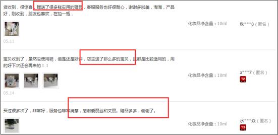 你幾乎可以在阿芙店鋪里面80%以上的評(píng)論里面看到這樣的描述:送了很多小贈(zèng)品、有好多小禮品、非常感謝客服妹妹申請(qǐng)了那么多的小贈(zèng)品……