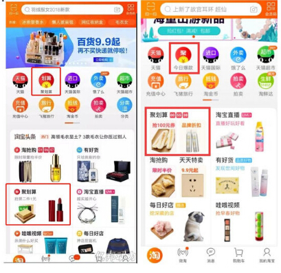 據(jù)手淘APP改版前的頁面顯示,聚劃算分別在首頁的功能區(qū)域和“淘寶頭條”下方有兩個(gè)入口。