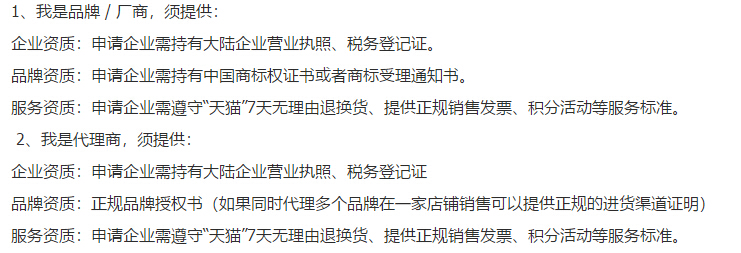 再然后,就是大家非常關(guān)心的想要入駐天貓的一系列的要求了,如下圖所示: