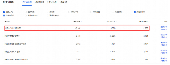找到核心詞之后再去通過我們的屬性詞找到目標詞也就是確定我們要去市場行情找到的我們的目標詞,目標詞=核心詞+1個/多個屬性詞,比如我們的連衣裙,搜索然后找到會有很多的相關延伸詞,這些都稱之為目標詞,但不是每一個目標詞數(shù)據(jù)都好。因為寶貝在上架之前適合做小詞,所以找到的目標詞要人氣高,競爭小,轉(zhuǎn)化好才適合產(chǎn)品前期的發(fā)展,比方說下面這個詞【網(wǎng)紅連衣裙 百搭 顯瘦】