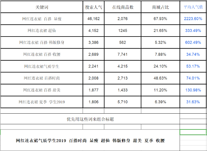 那最終組合的標題就是:【網(wǎng)紅連衣裙氣質(zhì)學生2019百搭時尚顯瘦超仙韓版修身甜美夏季收腰】,最后把空格刪除即可。組合過程中有個非常重要的點,就是我們找到了關鍵詞應該怎么去組合,組合的方法是什么呢?那接下來就是組合的幾個要點。