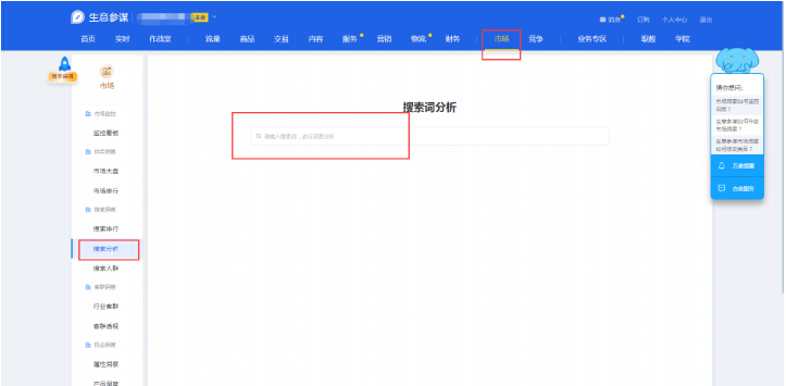 通過市場洞察來找詞組合標(biāo)題是我們經(jīng)常會(huì)用到的一個(gè)方式,首先我們需要進(jìn)入生意參謀后臺,點(diǎn)擊市場,然后點(diǎn)擊搜索分析這個(gè)位置,通過這個(gè)位置,我們可以直接來搜索查找我們想要找的關(guān)鍵詞,而且市場洞察的數(shù)據(jù)是最精準(zhǔn)的,所以通過這個(gè)方式來找詞也是最好,最完美的一種方式,一般找詞我們就看最近7天的數(shù)據(jù)。