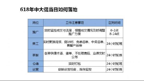 結(jié)合前面的各個(gè)時(shí)期的營(yíng)銷玩法,落實(shí)到各個(gè)崗位分工,包括的維度有:具體時(shí)間節(jié)點(diǎn)、具體的人員需要執(zhí)行的具體內(nèi)容。例如美工要做預(yù)熱頁(yè)面、大促首頁(yè)、大促后首頁(yè)、寶貝詳情頁(yè)優(yōu)化、大促各種試試海報(bào)、大促售罄圖、大促推廣圖、大促秒殺等; 客服方面就要做好主動(dòng)提醒收藏、提前設(shè)置快捷術(shù)語(yǔ)、設(shè)置旺旺簽名、自動(dòng)回復(fù)短語(yǔ)、補(bǔ)差價(jià)安撫術(shù)語(yǔ)等等; 倉(cāng)儲(chǔ)方面需要核實(shí)安全庫(kù)存、配備打包人員、提前質(zhì)檢、50%的主副推款提前打包、多次短信通知老客戶等;