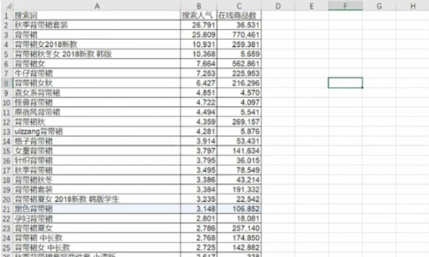然后建立一個(gè)Excel表格,將背帶裙相關(guān)的搜索結(jié)果都復(fù)制到表格,盡量多整理一些,