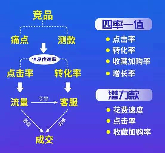 一款寶貝表現(xiàn)是否優(yōu)秀,直接的表現(xiàn)就是“四率一值”,分別是點擊率,轉(zhuǎn)化率,收藏加購率,增長率及UV價值。