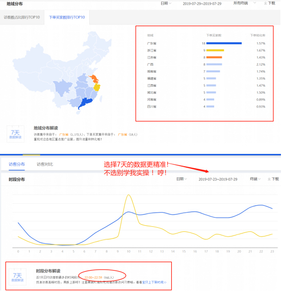 地域和時間,我們都參考生意參謀---流量---訪客分析里的數(shù)據(jù)。一般來說選擇7天的數(shù)據(jù)更為精準哦。