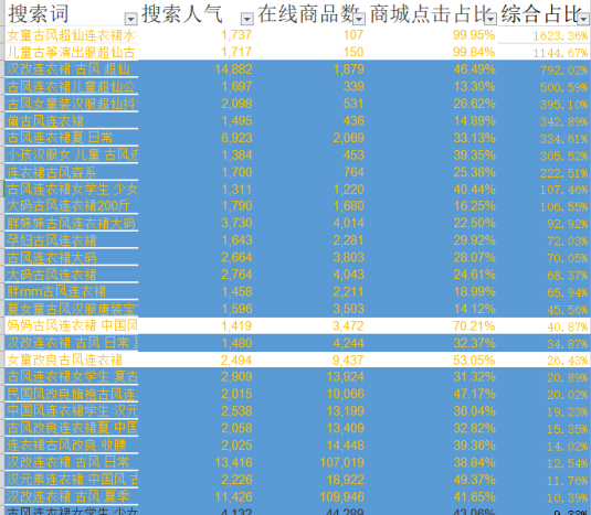 所以我們想要做標題優(yōu)化時,就先確定核心詞。但核心詞,可不只有一個,古風連衣裙,也可以叫做漢改連衣裙、復古連衣裙、中國風連衣裙。各個地方叫法不同,標題要就盡可能覆蓋用戶的需求,少一個核心詞就少一部分市場。