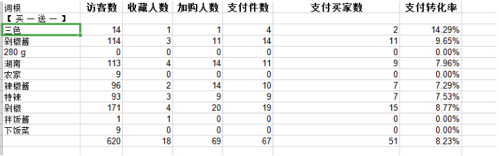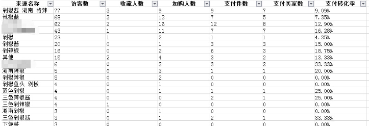 3.打開下載好的表格,留下訪客數(shù),收藏人數(shù),加購人數(shù),支付件數(shù),支付買家數(shù),支付轉(zhuǎn)化率。