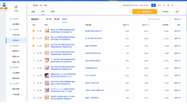 第一個方法是人氣寶貝分析,通過【市場洞察】-【市場排行榜】-【商品】-【高意向】篩選后,可以找到在該品類下的全網(wǎng)高意向產(chǎn)品(收藏人氣和加購人氣較高的產(chǎn)品)。