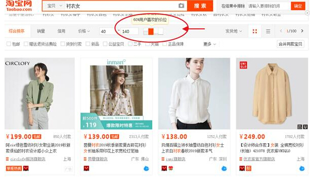 選款的價格上,我們可以通過對比此類產(chǎn)品的銷售價格層級,選擇符合銷售價在這一層級中的產(chǎn)品。當然這里我們要算好進價和銷售價格。例如下圖,我們搜索襯衣女,可以看到60%的用戶選擇了價位在40-140之間的產(chǎn)品,那么我們在選款的時候,就應該選擇銷售價可以再40-60之間這一價位的產(chǎn)品。其流量必定會比其他少數(shù)用戶喜歡的產(chǎn)品更高。