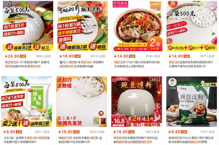 按銷量排序,分析同行可以看出,市場(chǎng)上豌豆淀粉的價(jià)格大部分集中在15塊錢(qián)左右兩斤,賣(mài)的好的都有刮刀、教程贈(zèng)送。