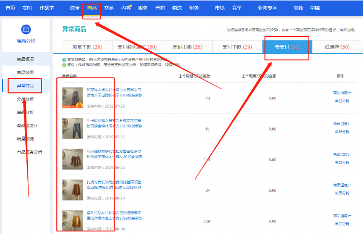 那怎么看店鋪的寶貝這是滯銷品,在這里我們點(diǎn)擊生意參謀、品類、返回舊版、商品、異常商品,可以看到店鋪零支付的那些寶貝。