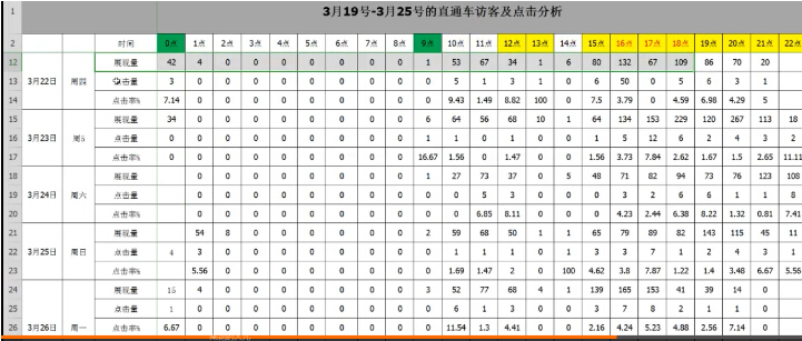 通過(guò)收集的數(shù)據(jù)匯成的表格,可以看出每個(gè)時(shí)間的點(diǎn)擊和轉(zhuǎn)化數(shù)據(jù),根據(jù)這些數(shù)據(jù),沒(méi)有點(diǎn)擊沒(méi)有轉(zhuǎn)化的不投放,有點(diǎn)擊有轉(zhuǎn)化的提高溢價(jià)。其項(xiàng)優(yōu)化項(xiàng)也是一樣收據(jù)數(shù)據(jù)做表格分析,以點(diǎn)擊率為核心,一個(gè)詞的點(diǎn)擊率好壞判別,展現(xiàn)300以上,一張圖點(diǎn)擊率好壞判別展現(xiàn)1500以上。