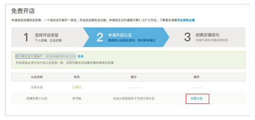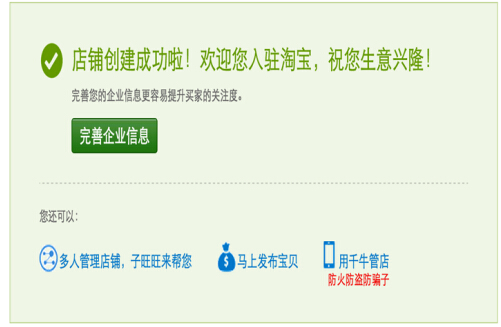 注冊(cè)淘寶賬戶并綁定企業(yè)支付寶賬戶→→完成支付寶賬戶商家認(rèn)證→→完成店鋪責(zé)任認(rèn)證→→創(chuàng)建店鋪成功