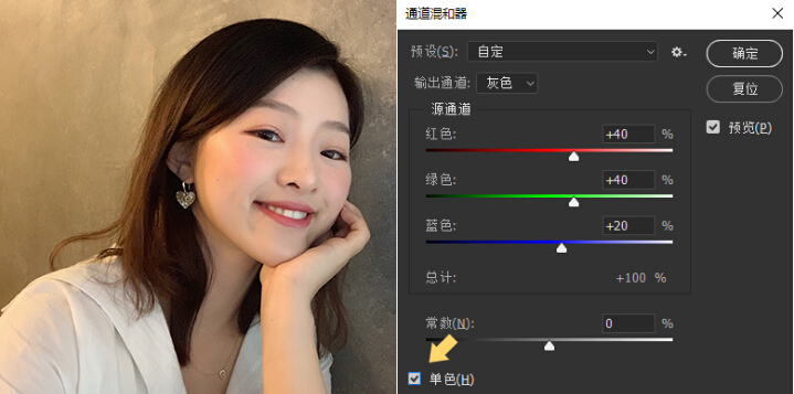 普通照片轉(zhuǎn)黑白照的方法很多,這里安利一種好用且不破壞黑白對(duì)比的方法:選擇菜單“圖像>調(diào)整>通道混合器”,在彈出面板左下角勾選“單色”,只要保持紅、綠、藍(lán)的總和在100左右,參數(shù)默認(rèn)也可,對(duì)比“去色”命令的效果圖可發(fā)現(xiàn),通道混合器做出的黑白效果更顯自然。