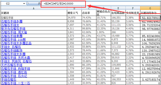 2、借助生意參謀-市場-搜索分析,計(jì)算關(guān)鍵詞的競爭力。如果我們店鋪是集市店,那么可以簡單的將數(shù)據(jù)的不同維度定義為正向指標(biāo)和負(fù)向指標(biāo),正向指標(biāo)相乘作為分子,負(fù)向指標(biāo)相乘作為分母,最終得 到每個(gè)關(guān)鍵詞的競爭力;
