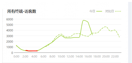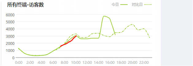 我們可以看到虛線是昨天的數(shù)據(jù)曲線圖,實(shí)線是今天的實(shí)時(shí)曲線圖,我們可以非常直觀地進(jìn)行對比,判斷下一個(gè)時(shí)間段的流量趨勢。