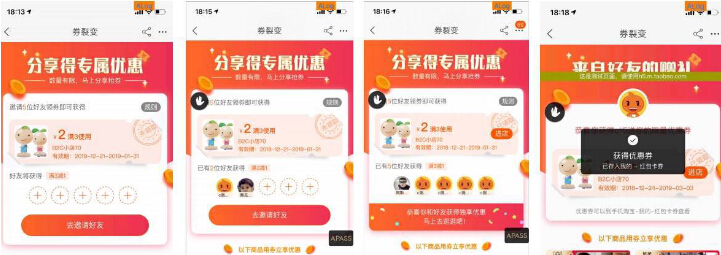 那么BCD呢,他們也有劵嗎?也有,只不過是你所設(shè)置的子劵,也就是被分享者劵,一般來說子劵會比父劵金額少一些(打個比方是100-10),如果BCD在看到A所獲取到的父劵之后,發(fā)現(xiàn)還有大額的父劵是可以去領(lǐng)的,那么他們就可能會再次發(fā)起一次分享。