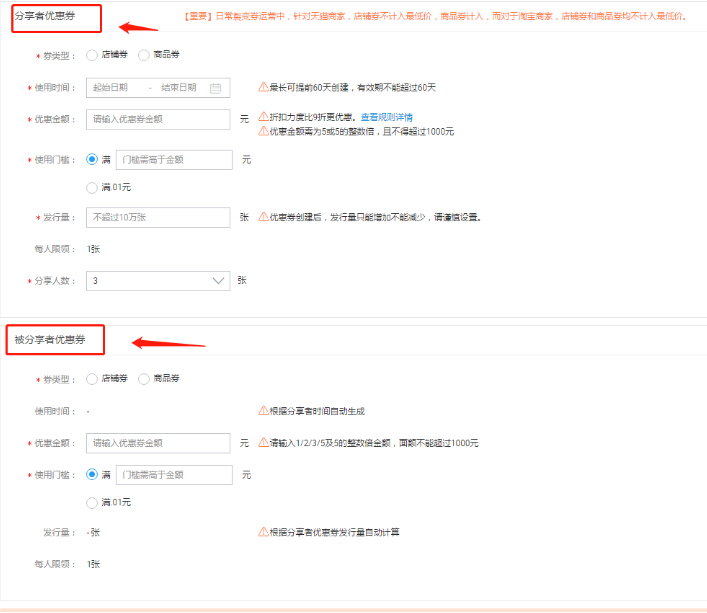 裂變劵的設(shè)置方式和其他的劵并沒有什么不同,唯一的不同就是設(shè)置的是兩種劵,和設(shè)置分享幾個人才能得到這張優(yōu)惠券的門檻。