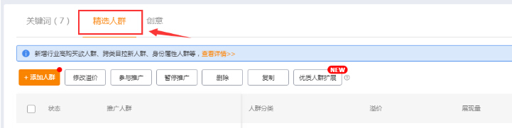 進入直通車后臺—新建自定義標(biāo)準(zhǔn)計劃—編輯推廣內(nèi)容—找到精選人群—添加人群