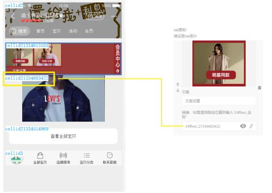 若希望點(diǎn)擊tab時(shí)不進(jìn)行跳出,而僅僅只是滾動(dòng)到頁(yè)面上的指定區(qū)域,只需在tab跳轉(zhuǎn)鏈接的位置,輸入”//#floor_樓層id”,對(duì)應(yīng)的樓層id在編輯器預(yù)覽視圖每個(gè)模塊的做左上角