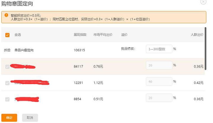 然后點開投放人群里面的購物意圖定向,因為產(chǎn)品已經(jīng)形成自己的標簽,所以系統(tǒng)會根據(jù)產(chǎn)品的標簽來給推薦一部分的關(guān)鍵詞,我們需要做的就是把這些全部選擇投放,也是出一樣的溢價后面根據(jù)關(guān)鍵詞的表現(xiàn)來通過對溢價的調(diào)整,從而達到更好的效果。設置好關(guān)鍵詞之后也是把手機端所有的投放入口全部打開,設置同樣的溢價,也是通過后期調(diào)整溢價來進行優(yōu)化。