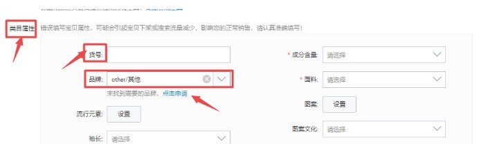 三、對于產(chǎn)品的類目屬性,不同的類目也都是不一樣的,對于產(chǎn)品的 貨號,是賣家自己填寫的,是方便賣家自己管理的,對于產(chǎn)品的品牌選項,如果有授權(quán)書或者是能夠證明是正品的發(fā)票等,那就可以選擇相應(yīng)的品牌,如果沒有,那就可以選擇其他這個選項,防止被舉報投訴售賣假貨,這樣容易對店鋪造成嚴(yán)重影響,輕則扣分,重則可能會造成封店等等,所以我們對于這個的選項要慎重