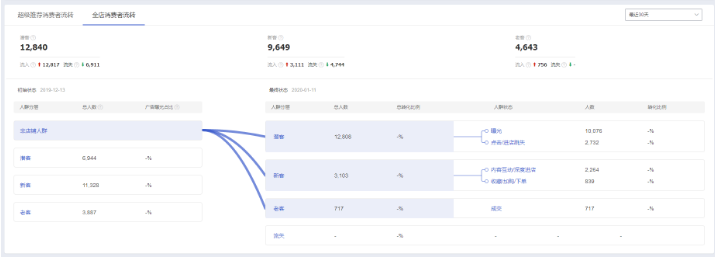 非店鋪用戶就是指與你店鋪毫無關(guān)系的用戶,可以說絕大部分用戶都是跟你店鋪沒有任何關(guān)系的。潛客就是指跟你店鋪有點(diǎn)關(guān)系的用戶,看到過你的店鋪,或者是進(jìn)店瀏覽跳失用戶,但是對(duì)你的店鋪沒有什么太大的興趣。新客指的是在內(nèi)容渠道跟你有過互動(dòng),或者是有深度瀏覽,或者是進(jìn)店之后有過收藏、加購,或者有過拍下未付款行為等等,這種屬于新客,他們對(duì)你店鋪產(chǎn)生了一定的興趣,但是還是沒有成交。老客就比較好理解,就是指成交用戶。