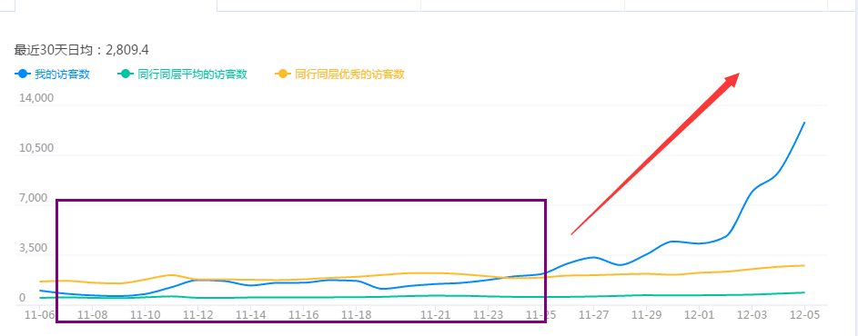 標(biāo)注:這個階段可以看到,10月份到11月初的店鋪數(shù)據(jù)并不是很好雙十一前也一直處于不溫不火的狀態(tài),相信很多賣家朋友都經(jīng)歷過或者正在經(jīng)歷著,那么這一個多月的時間這個店鋪都在忙些什么事情,做了哪些動作,店鋪的訪客會有這樣的變化,想必這些才是大家堅持耐心不厭其煩的看這個帖子最關(guān)鍵的因素了(其實我懂你的),事出必有因,接下來我來挑幾個點重點說一下。