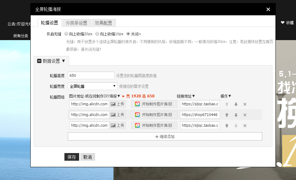 在海報輪播選擇編輯,可根據(jù)自己的要求進(jìn)行設(shè)置,來做寶貝的輪播。