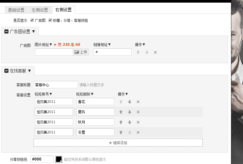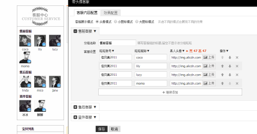 在圖中我們看到可以設(shè)置名字與旺旺的鏈接,還可以上傳客服頭像圖片,但需要注意大小。