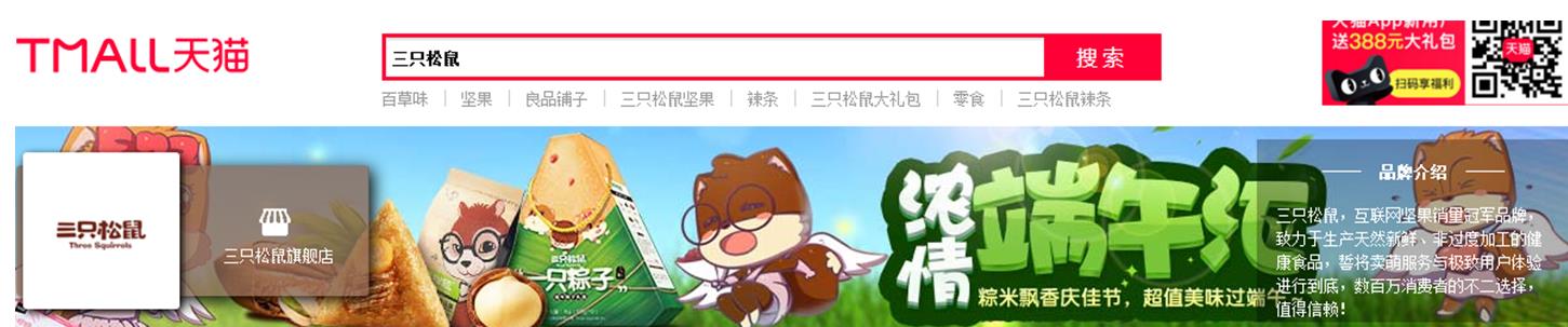 這是在天貓搜索三只松鼠出來的界面,我只截取了最上面的一部分,下面產(chǎn)品部分沒有截取。做過鉆石展位的應該都知道,這是明星店鋪的一種展現(xiàn)(現(xiàn)在的明星店鋪在品銷寶里面,不在鉆石展位了哈)