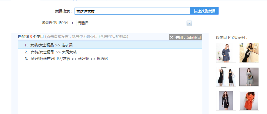 發(fā)布類目呢,我們不要輸入大詞,行業(yè)詞。比如面膜,女裝等等,我們定位輸入的核心詞應(yīng)該是我們的主推關(guān)鍵詞這樣我們定位出來的類目才是最準確的類目。如果我們的定位不精準,選錯了類目,會導(dǎo)致即使我們推起來人氣,他的轉(zhuǎn)化率依舊非常低。接下來我們輸入雪紡連衣裙,快速找到類目,于是第一項女裝/女士精品連衣裙就是最符合我們的類目,我們可以看右方的寶貝示例來做對比。