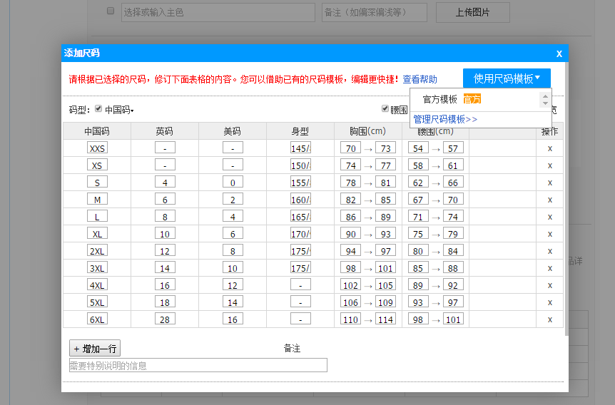 根據(jù)產(chǎn)品屬性來填寫以下內(nèi)容,注意尺碼可以根據(jù)自己的要求去自定義設(shè)置。也可使用模板