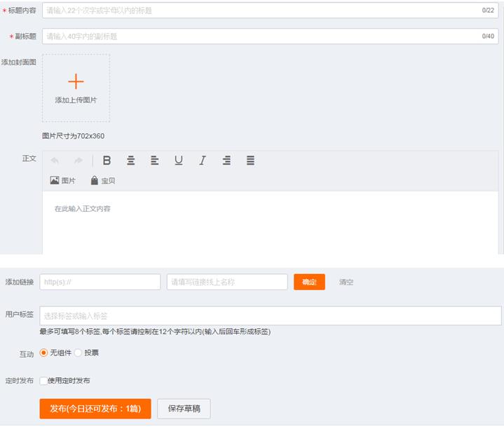 標題內(nèi)容和副標題必填項,標題22個字,副標題40個字,都不能還有違禁詞。然后上傳圖片。圖片大小是702x360,圖片要清晰有看點。接下來把寫好的內(nèi)容放入正文。正文下面的鏈接添加我們關(guān)聯(lián)產(chǎn)品的鏈接和產(chǎn)品的品名。用戶標簽一項,要填跟我們產(chǎn)品和定位相關(guān)的詞,精準的詞,不是越多越好。在下面就是關(guān)于互動,默認只有投票,7月底微淘會更新,會增加更多的功能,當(dāng)然也可以購買一些組件,實現(xiàn)不同的功能。關(guān)于組件要跟大家重點說一下,大家在服務(wù)市場可以搜索“組件”,會有很多微淘的組件,雖然會收費,一個月也就十多元,但是可以實現(xiàn)好多功能,相當(dāng)超值的。當(dāng)然新品的打造一個新品的銷量及流量計劃至關(guān)重要,這個是打造爆款很重要的,不會做計劃的可以加文章最后的旺旺群,聯(lián)系群主送你。