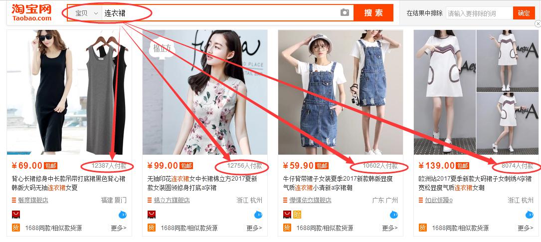 通過(guò)關(guān)鍵詞做出來(lái)的結(jié)果我們可以看到產(chǎn)品的付款人數(shù),我們可以看到通過(guò)連衣裙搜索出來(lái)的首頁(yè)展現(xiàn)出來(lái)的產(chǎn)品付款人數(shù)都是要過(guò)萬(wàn),說(shuō)明想要通過(guò)這個(gè)關(guān)鍵詞獲得展現(xiàn),產(chǎn)品自身的基礎(chǔ)要十分的強(qiáng)。