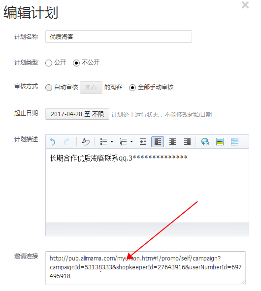 如果勾選不公開是不會被淘客看到或者搜索到的會產(chǎn)生一個鏈接將這個鏈接復(fù)制給你所要合作的淘客讓他們?nèi)ド暾垺?/p>