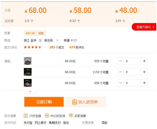 這時我們就要考慮一下,供應(yīng)商的商品價格,我們也在淘寶上賣50-65元之間,是否有利潤空間。如果有利潤,我們就可以考慮進(jìn)貨,但還是不要急于進(jìn)貨。為什么還不進(jìn)貨哪?我們還要考察一下供應(yīng)商的生產(chǎn)能力。如果供應(yīng)商不具備生產(chǎn)能力,一旦我們選擇的商品在淘寶熱銷,會導(dǎo)致產(chǎn)品脫銷,后果很可怕。