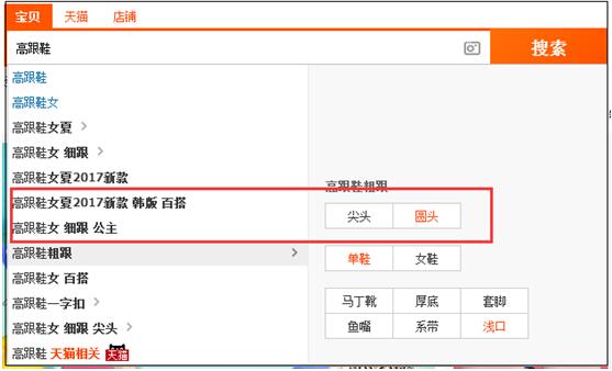這些詞是熱詞么?當(dāng)然是熱詞,否則淘寶的下拉框中也不會推薦這些詞,尤其是那些帶顏色的詞,比如說“圓頭”、“單鞋”、“淺口”等等。并且消費者在點擊這些詞的時候,后臺還會進一步增加這些詞的搜索指數(shù)。