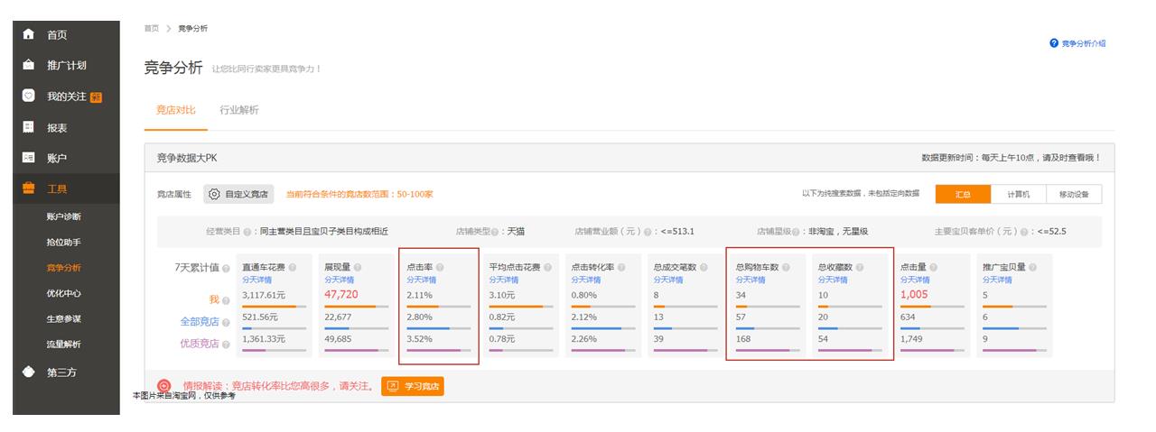首先是點擊率,測款的時候我們的點擊率沒有必要非要高于同行,但最起碼要達到行業(yè)平均,這樣可以保證我們分數(shù)不會下降。具體同行的點擊率怎么看?可以在直通車工具里的競爭分析中了解。