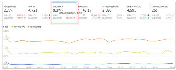 打開生意參謀,在首頁就可以看到你的綜合支付轉(zhuǎn)化率跟同行同層均值對比的情況,一般情況(我這里為什么說一般情況,因?yàn)檫€有特殊的),如果你的這個(gè)綜合支付轉(zhuǎn)化率遠(yuǎn)低于行業(yè)均值的話,都意味著你在消化流量的能力上是不行的,顯而易見的,搜索引擎就會(huì)減少對你免費(fèi)自然搜索流量的扶植。