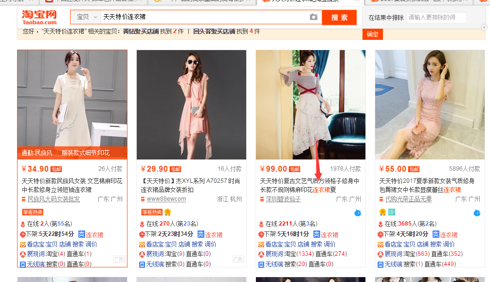 第二,大家發(fā)現(xiàn)沒有,在我們搜索后寶貝標題,只描紅了‘連衣裙’這個詞根 ,而‘包郵’并沒有被描紅,這說明了什么?這說明‘包郵’是一個系統(tǒng)默認關(guān)鍵詞。在買家搜索‘包郵’的時候,搜索引擎會直接默認展示包郵產(chǎn)品,在標題中有無‘包郵’,都是無所謂的,搜索引擎不會去甄別他。