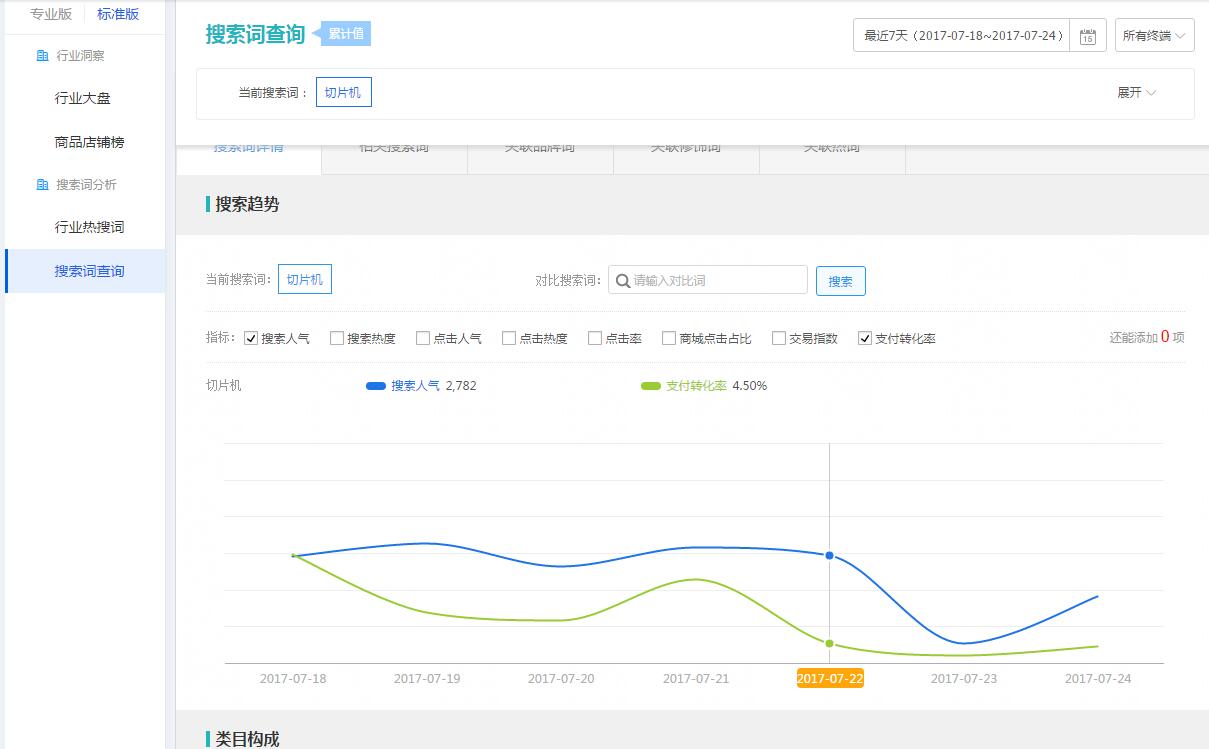 以上是按照每天統(tǒng)計曲線,這個關(guān)鍵詞的搜索指數(shù)每天在3000左右,關(guān)鍵詞轉(zhuǎn)化率在5%左右。