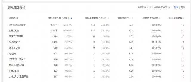 在退款原因分析里面,你可以看到該單品的退款原因是什么,每一個(gè)原因占比是多少,產(chǎn)生糾紛的筆數(shù)是多少等等。